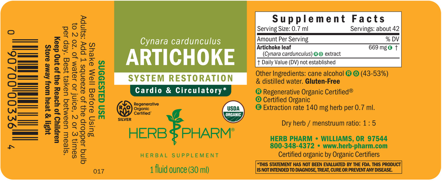Experience the regenerative difference! Our Regenerative Organic Certified® Artichoke liquid herbal extract is made from the leaves of Cynara cardunculus plants. We harvest Artichoke in both the spring and autumn on our Regenerative Organic Certified® farms in southern Oregon. Adding this herbal ally to your wellness rituals can help you maintain established, normal cholesterol levels.*