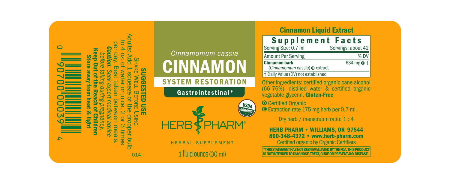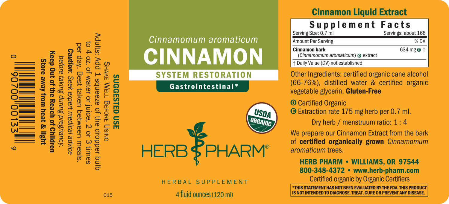 We prepare our Cinnamon extract from the bark of Certified Organic Cinnamomum aromaticum syn. cassia trees. To assure thorough extraction of Cinnamon's aromatic oils and resins, the bark is harvested and carefully shade-dried before the meticulous extraction process.