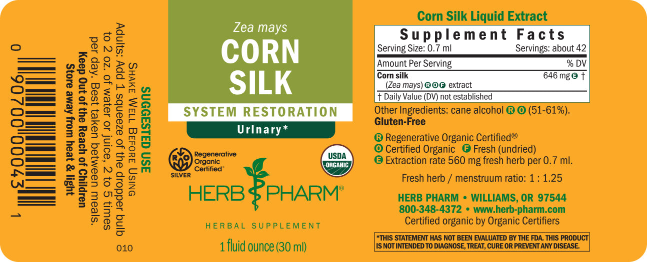 We prepare our Corn Silk extract from the fresh (never dried) silks of Certified Organic Zea mays plants. These smooth and soft silks are harvested from Corn stalks grown as annuals on our Regenerative Organic Certified® farms in southern Oregon.