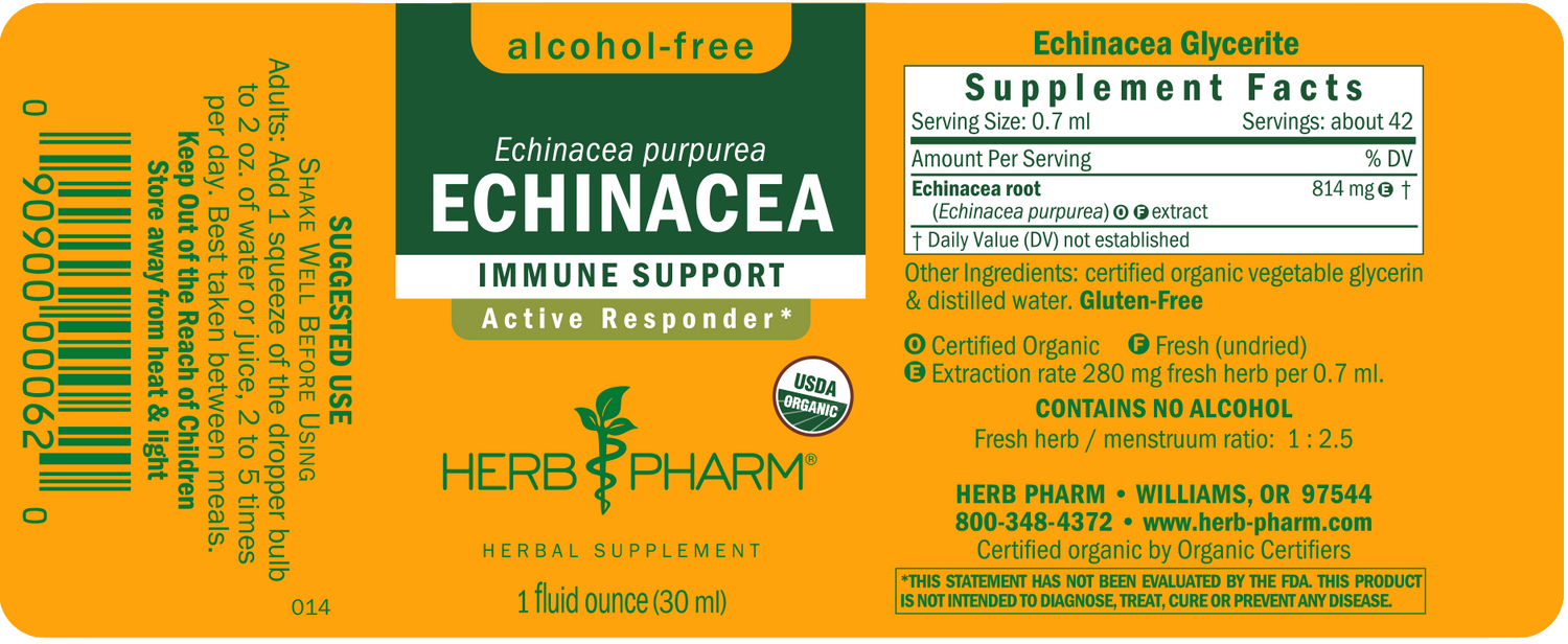 We prepare our alcohol-free Echinacea glycerite from the Certified Organic root of Echinacea purpurea plants. To assure optimal extraction of the herb's bioactive compounds, we harvest the roots during the autumn and promptly extract them while still fresh and succulent.