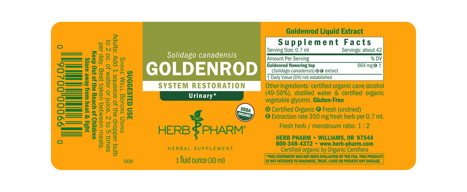 We prepare our Goldenrod extract from the fresh (never dried) flowering tops of Solidago canadensis plants grown on our own Certified Organic farms in southern Oregon. The plants are harvested early each summer then extracted fresh the same day.