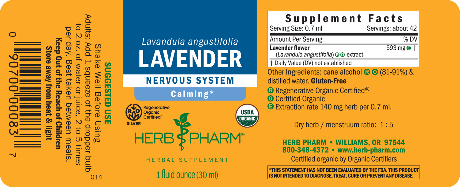 Show your nervous system some kindness with our Regenerative Organic Certified® Lavender liquid herbal extract. Traditionally, Lavender is used for relaxing and calming oneself. It has also been used traditionally for nervous stomachs, gas, and motion sickness. We prepare this herbal ally from the flowers of Lavandula angustifolia shrubs grown on our Regenerative Organic Certified® farms in southern Oregon. Familiar and aromatic, the herb thrives in Mediterranean-style climates.*