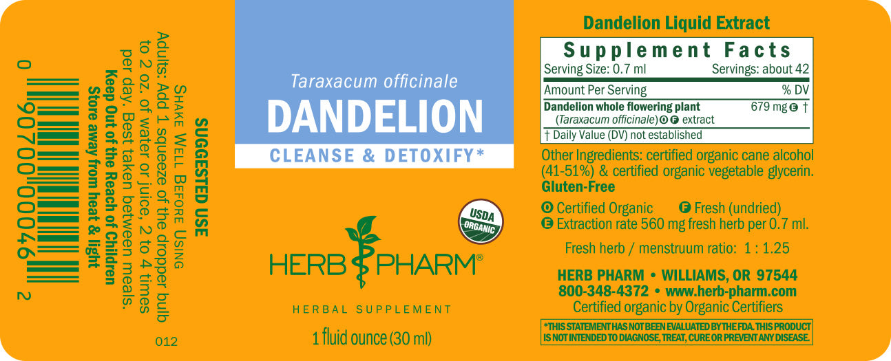 We prepare our Dandelion extract from fresh (never dried) whole Certified Organic Taraxacum officinale plants (root, leaf and flower) grown on our own farms in southern Oregon. The plants are grown in neat rows, harvested each spring and often have taproots over a foot in length. To assure optimal extraction of the herb's bioactive compounds, the plants are hand-harvested while in full flower and then promptly extracted while still fresh and succulent.